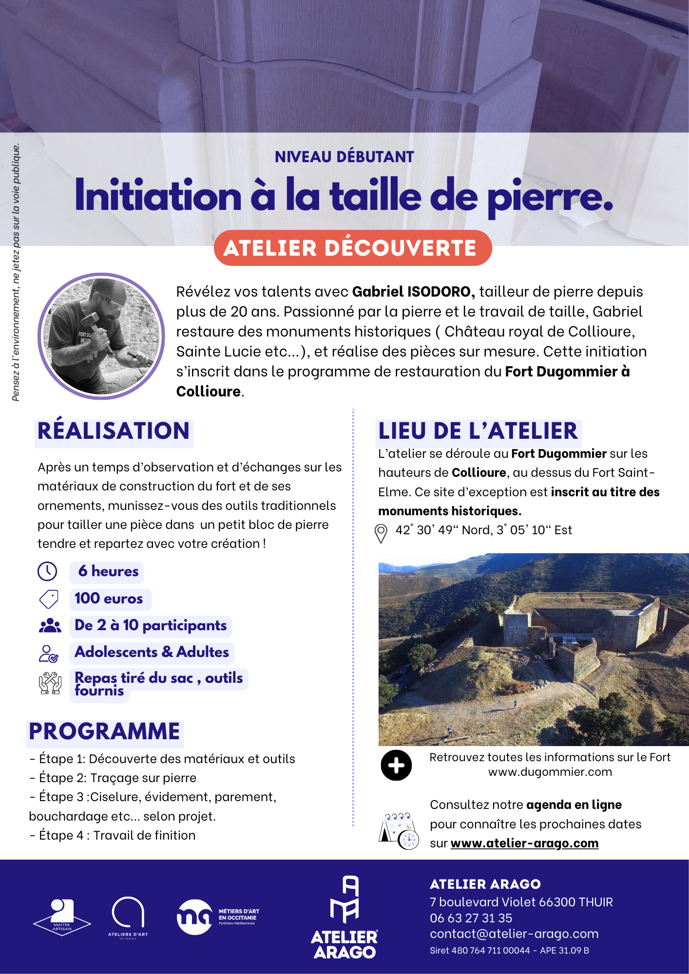 Révélez vos talents avec Gabriel ISODORO, tailleur de pierre depuis plus de 20 ans. Passionné par la pierre et le travail de taille, Gabriel restaure des monuments historiques ( Château royal de Collioure, Sainte Lucie etc…), et réalise des pièces sur mesure. . Cette initiation s’inscrit dans le programme de restauration du Fort Dugommier à Collioure.