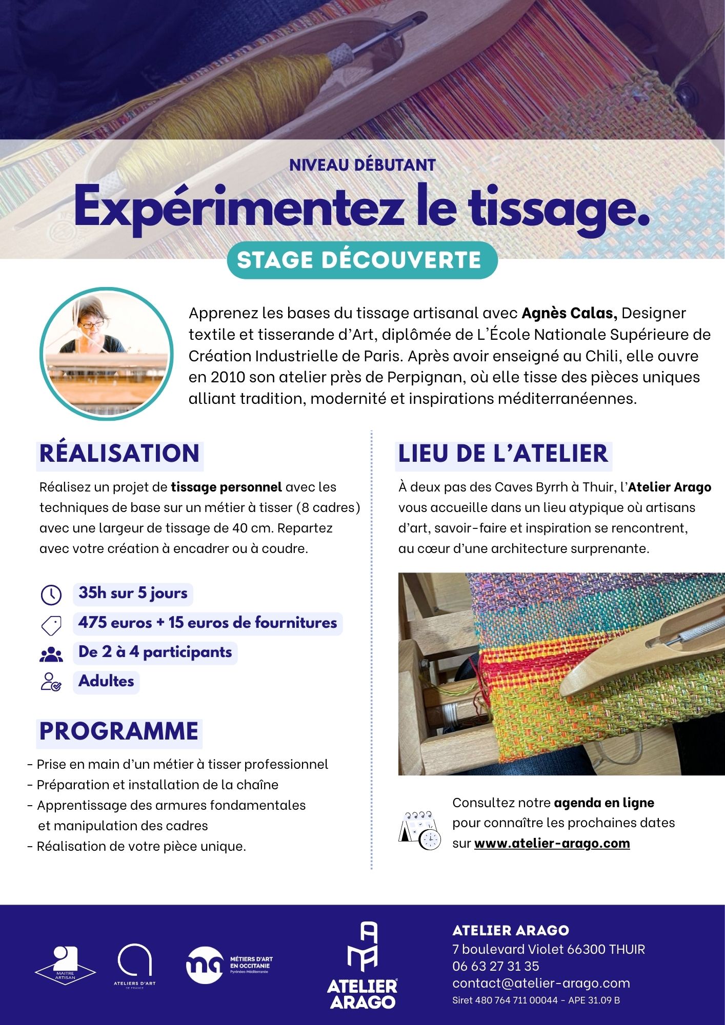 Apprenez les bases du tissage artisanal avec Agnès Calas, Designer textile et tisserande d’Art, diplômée de L’École Nationale Supérieure de Création Industrielle de Paris. Après avoir enseigné au Chili, elle ouvre en 2010 son atelier près de Perpignan, où elle tisse des pièces uniques alliant tradition, modernité et inspirations méditerranéennes.