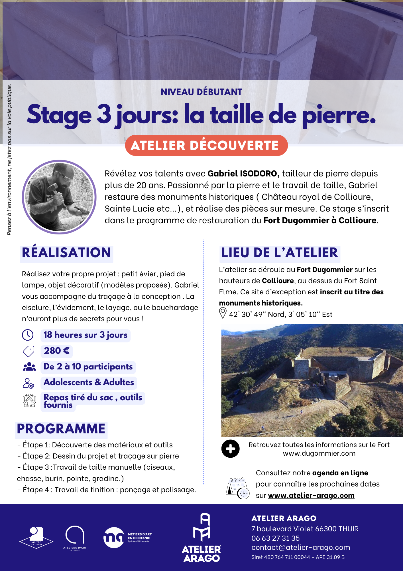 Révélez vos talents avec Gabriel ISODORO, tailleur de pierre depuis plus de 20 ans. Passionné par la pierre et le travail de taille, Gabriel restaure des monuments historiques ( Château royal de Collioure, Sainte Lucie etc…), et réalise des pièces sur mesure. . Ce stage s’inscrit dans le programme de restauration du Fort Dugommier à Collioure.